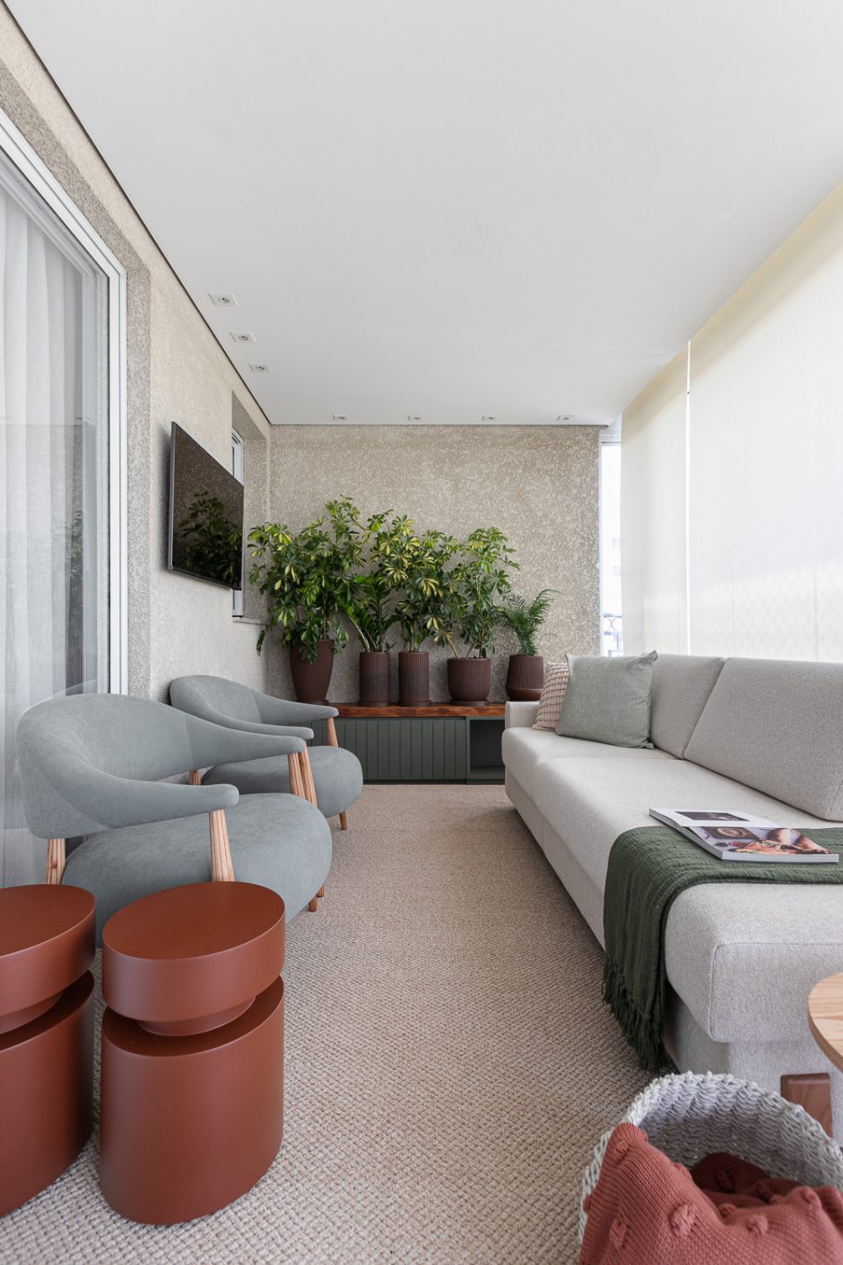 A reforma no bairro Vila Olímpia em São Paulo abrangeu a área social do apartamento, transformando lavabo, sala, hall de entrada e varanda em espaços integrados e acolhedores. “Os moradores precisavam manter elementos já presentes no apê mas não viam como compor os móveis de forma que se reconhecessem no espaço, e essa foi nossa intenção.”